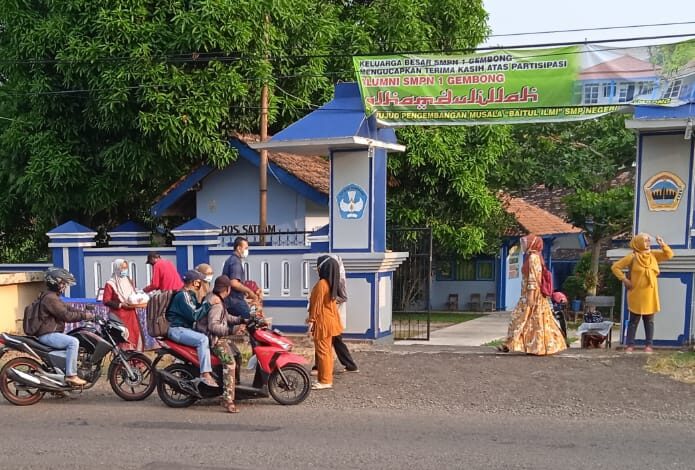 Walaupun di tengah pandemi virus corona (Covid-19), pembagian takjil gratis di depan SMP Negeri Gembong, Pati berjalan lancar dengan tetap menerapkan protokol kesehatan.