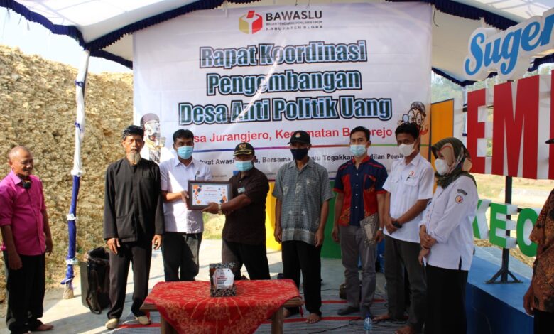 Mengantisipasi hal itu, Rabu (9/60 lalu dilaksanakan kegiatan deklarasi “Desa Anti Politik Uang” yang bertempat di tepi Embung Desa Jurangjero Kecamatan Bogorejo. Acara tersebut dihadiri kepala desa dan tokoh masyarakat setempat, serta disaksikan jajaran Bawaslu Kabupaten Blora.