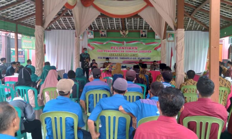 BOJONEGORO. – Bertempat di balai desa setempat, Kepala Desa Mulyorejo, Sahri, Kamis (10/6) lalu resmi melantik Tutut Arisona sebagai Sekretaris Desa Mulyorejo, Kecamatan Tambakrejo, Bojonegoro.