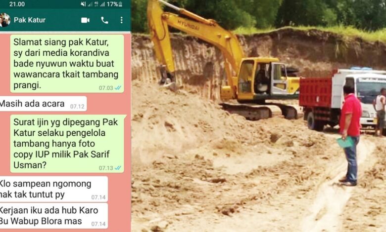 Sungkono yang akrab disapa Katur ketika hendak ditemui wartawan, Rabu (30/6) lalu terkesan menghindar. Dan ketika dikonfirmasi perihal legalitas yang digunakan dalam kegiatan usaha tambang di Desa Prangi, melalui whatsapp (WA) dia malah menjawab dengan nada mengancam. Tidak hanya itu, Sungkono juga sempat membawa-bawa nama wakil bupati Blora.