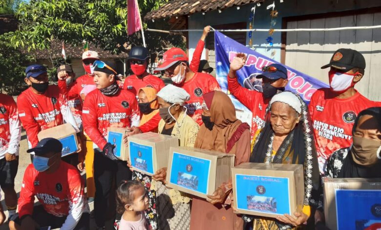 BLORA. – Komunitas sepeda ontel Dapur Wojo Blora menyerahkan bibit buah dan paket sembako kepada warga kurang beruntung sambil memasyarakatkan olah raga bersepeda.