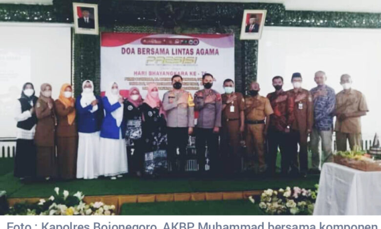 Salah satu penopang kemajuan daerah adalah terciptanya situasi yang kondusif dalam bingkai keberagaman. Berdasar hal tersebut, Polres Bojonegoro Jawa Timur kemarin menggelar doa bersama lintas agama dalam rangka Hari Bhayangkara ke-76 tahun 2022 yang digelar oleh Rumah Sakit Bhayangkara (RSB) Wahyu Tutuko, bertempat di Gedung Pancasila Jalan Pemuda, Kecamatan Kota Bojonegoro, Selasa 21/06/2022.
