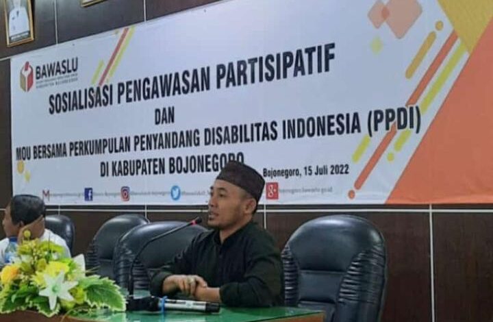 Sembilan belas bulan jelang Pileg (Pemilihan Legislatif) dan Pilpres (Pemilihan Presiden) Bawaslu Bojonegoro makin giat laksanakan Sosialisasi pada seluruh lapisan masyarakat. Utamanya pada pemangku kepentingan lintas profesi. Kali ini salah satu penyelenggara Pemilu tersebut laksanakan sosialisasi Pengawasan Partisipatif Dan Penandatanganan Nota Kesepahaman bersama Perkumpulan Penyandang Disabilitas Indonesia (PPDI) Kabupaten Bojonegoro, Jumat (15/07/2022). Kegiatan dilaksanakan di Ruang Meliwis Putih Bakorwil Bojonegoro, dengan dihadiri oleh 35 orang dari dan 5 orang dari Gerkatin.