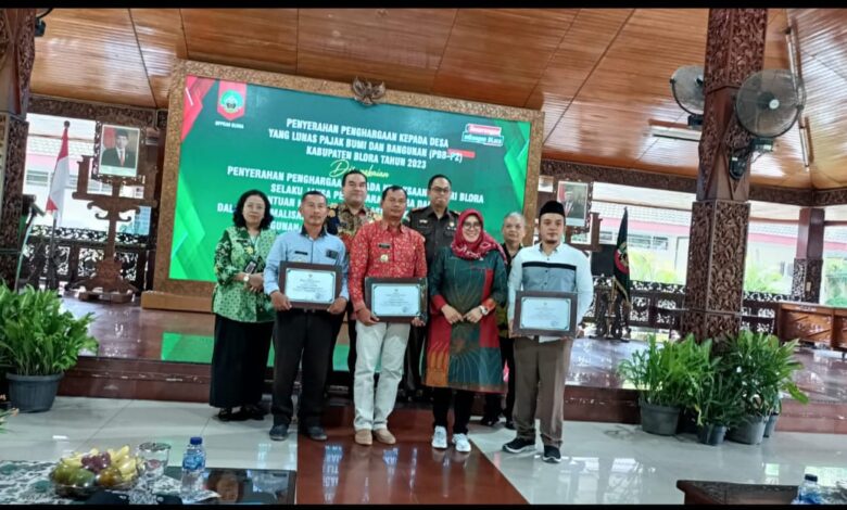 Sehubungan dengan lunas Pajak Bumi Bangunan Perdesaan dan Perkotaan (PBB-P2) Tahun 2023, sebanyak 51 desa dari berbagai kecamatan memperoleh penghargaan dari Pemkab Blora, Selasa (30/5/2023). Didampingi kepala BPPKAD Blora, Slamet pamuji SH, Bupati Blora H. Arif Rohman, S.IP., Msi memberikan langsung penghargaan tersebut di pendopo rumah Dinas Bupati Blora.