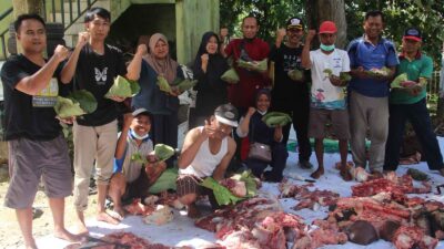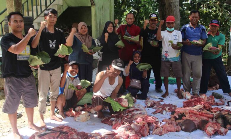 “Potongan daging sapi lalu dibungkus dengan daun jati untuk dibagikan kepada yang berhak,” kata Suwito.