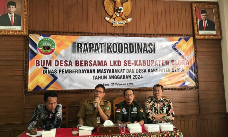 Bertempat di Aula Dinas Pemberdayaan Masyarakat dan Desa (PMD) Kabupaten Blora, digelar Rapat Koordinasi (Rakor) BUMDes bersama Lembaga Kemasyarakatan Desa (LKD) dengan melibatkan puluhan peserta dari 14 kecamatan se-Kabupaten Blora, Selasa (20/2/2024).