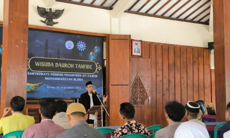 Korandiva-BLORA.- Pondok Pesantren At-Tajdid Muhammadiyah Blora sukses menggelar acara Wisuda Dauroh Tahfidz yang berlangsung pada hari Senin, 30 September 2024, bertempat di Pendopo Kecamatan Cepu. Acara ini menjadi momen penting bagi tujuh santriwati yang telah berhasil menyelesaikan program tahfidz Al-Qur’an selama dua bulan.