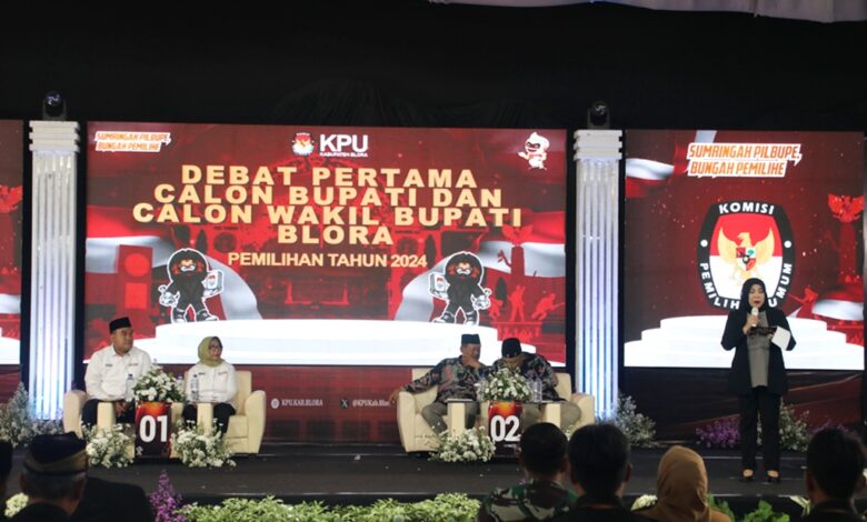 Korandiva-BLORA.- Komisi Pemilihan Umum Daerah (KPUD) Blora menyelenggarakan debat publik perdana Pilkada Blora 2024 di gedung Graha Larasati dengan tema pembangunan ekonomi yang berkualitas untuk meningkatkan kemakmuran masyarakat Blora, Senin (4/11/2024).