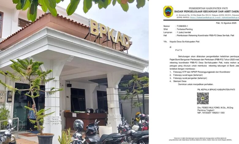 Korandiva-PATI.- Badan Pengelolaan Keuangan dan Aset Daerah (BPKAD) Kabupaten Pati resmi mengeluarkan surat edaran terkait mekanisme pengembalian kelebihan pembayaran Pajak Bumi dan Bangunan Perdesaan dan Perkotaan (PBB-P2) tahun 2025. Surat edaran dengan nomor T/296/900.1 tertanggal 12 Agustus 2025 itu ditujukan kepada seluruh kepala desa se-Kabupaten Pati dan bersifat terbatas/penting.