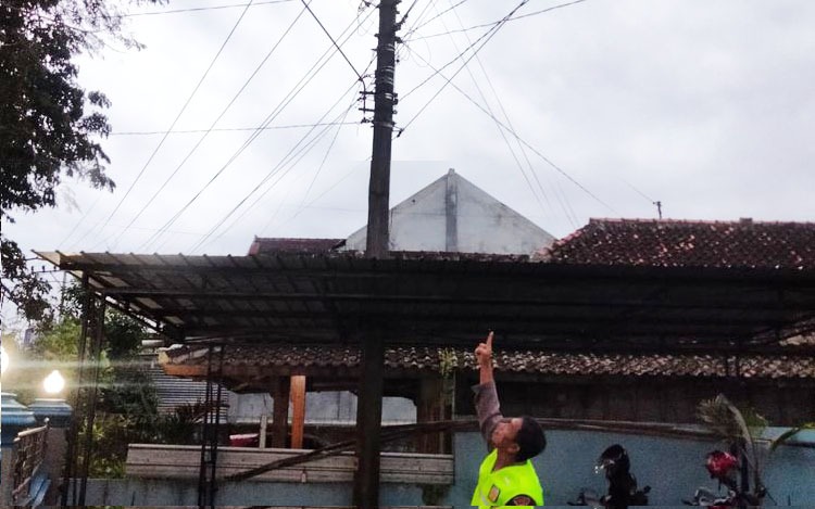 Tiang bendera setinggi kurang lebih 15 meter berbahan pipa besi itu perlahan diangkat. Dua orang lainnya datang membantu karena beban tiang yang cukup berat. Di atas mereka, jaringan kabel listrik tegangan tinggi milik PLN membentang melintang di depan kantor—jaraknya tak lebih dari dua meter dari posisi berdirinya tiang.