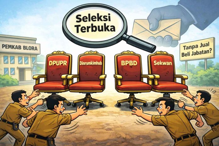 Korandiva-BLORA.— Setelah lama diisi pelaksana tugas (Plt), Pemerintah Kabupaten Blora akhirnya membuka seleksi jabatan pimpinan tinggi pratama (JPTP) untuk empat posisi kepala dinas strategis. Namun di tengah langkah itu, publik menyoroti keseriusan Pemkab dalam membuktikan janji bahwa seleksi benar-benar bersih dari praktik jual beli jabatan.